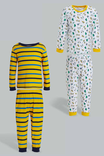 Yellow And White Striped Printed Pyjama Set (Pack of 2) طقم بيجامة مخطط بطبعة باللون الأصفر والأبيض (طقمين)