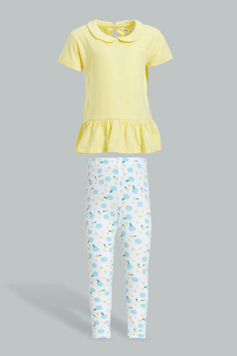 Yellow T-Shirt With White Floral Legging Set (2 Piece) طقم كاجوال بطبعة أزهار باللون الأصفر والأبيض (قطعتين)