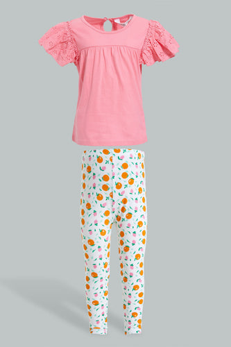 Pink Frill T-Shirt With White Orange Legging Set (2 Piece) طقم كاجوال بطبعة برتقال باللون الوردي والأبيض (قطعتين)