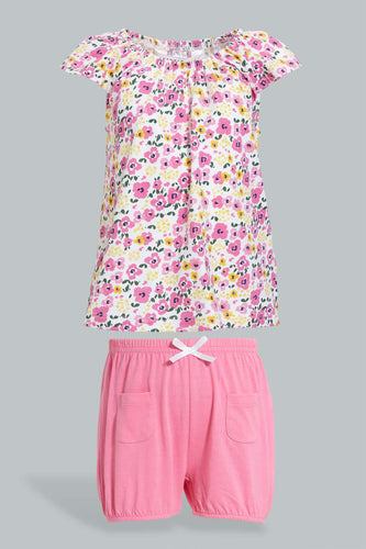 Pink Floral Print With Short Set (2 Piece) طقم كاجوال بطبعة أزهار باللون الوردي (قطعتين)