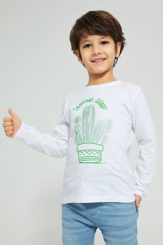 White Cactus Long Sleeve T-Shirt تيشيرت بطبعة صبار باللون الأبيض