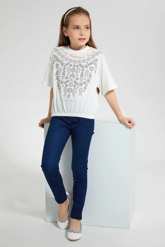 White Top With Studs and Placement Print بلوزة باللون الأبيض بطبعة