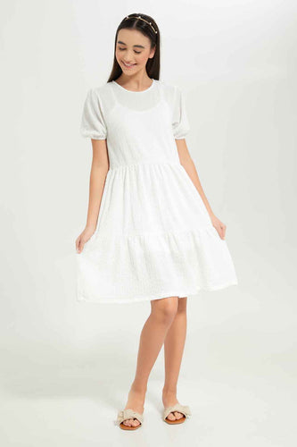 فستان أبيض مزين باللون الأبيض للبنات الكبار