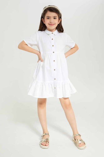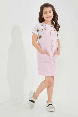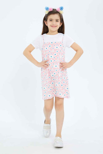طقم فستان باللون الأبيض والوردي مع تيشيرت للبنات الصغار (قطعتين)