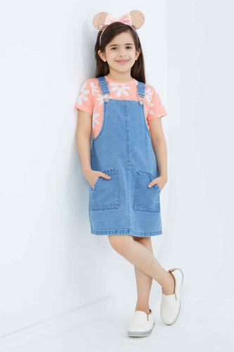 فستان جينز وتيشيرت باللون الابيض والوردي للبنات
