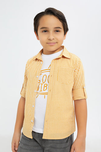 طقم كاجوال كاروهات باللون الأصفر والأبيض للأولاد الصغار(قطعتين)