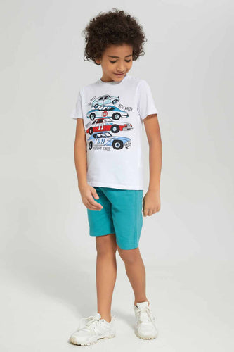 طقم كاجوال باللون الأبيض والأزرق بطبعة سيارة للأولاد الصغار (قطعتين)