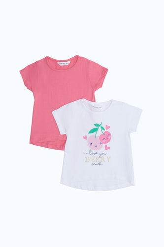 طقم تيشيرت مطبوع باللون الأبيض والوردي للبنات الرضّع (قطعتين)