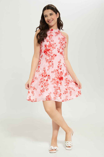 فستان باللون الأحمر والوردي بطبعة زهر للبنات الكبار