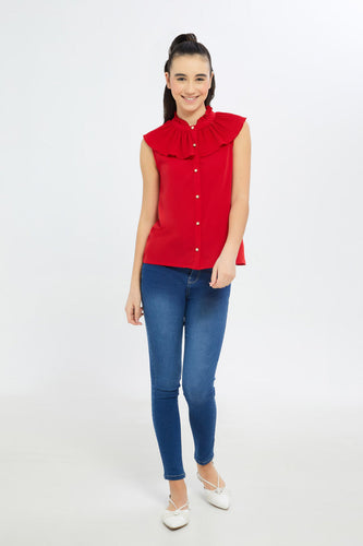 بلوزة بياقة مكشكشة باللون الأحمر للبنات الكبار