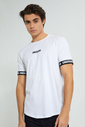 White Stretch T-Shirt With Cuff Tape تيشيرت باللون الأبيض بحواف مطبوعة على الأكمام