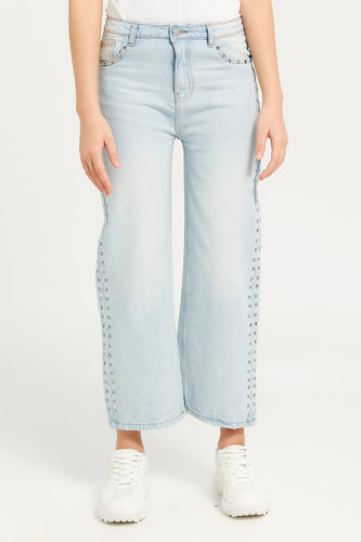 بنطلون أزرق واسع الساق للفتيات الكبيرات مع مسامير
