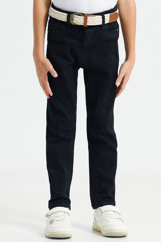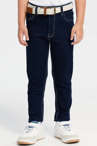 • بنطلون جينز أزرق داكن بحزام وخمسة جيوب للأولاد