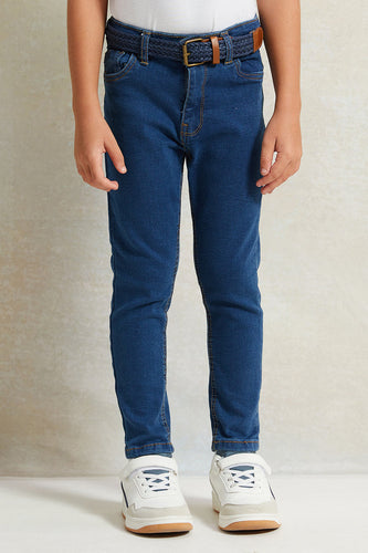• بنطلون جينز بحزام وخمسة جيوب للأولاد باللون الأزرق