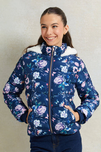 سترة مبطنة بغطاء رأس بطبعة زهور باللون الأزرق الداكن للفتيات الكبيرات