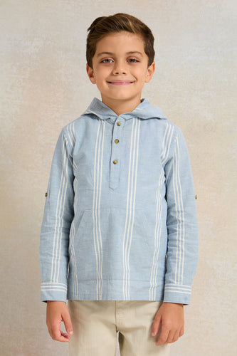 قميص مخطط باللون الأزرق للأولاد مع غطاء للرأس