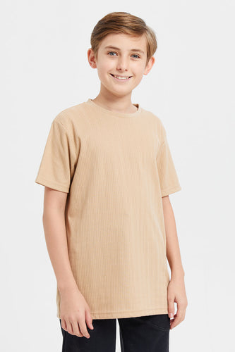 تي شيرت مخطط بأكمام قصيرة باللون البيج للأولاد الكبار