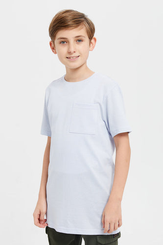 تي شيرت للأولاد الصغار باللون الأزرق بأكمام قصيرة وجيب
