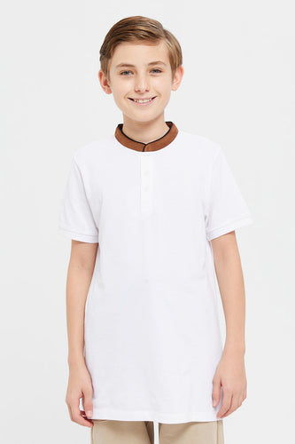 قميص بولو بياقة ماندارين أبيض للأولاد الكبار