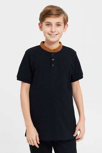 قميص بولو بياقة ماندارين أسود للأولاد الكبار