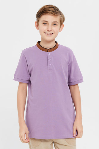 قميص بولو للأولاد الكبار باللون الأرجواني الفاتح وياقة الماندرين