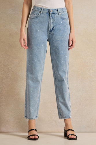 • بنطلون جينز نسائي أزرق مطرز بقصّة "مام فيت"