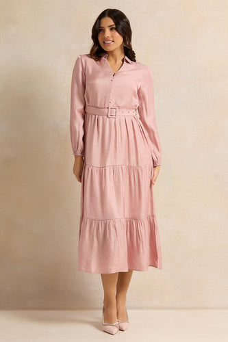 فستان وردي لامع متعدد الطبقات بحزام للنساء