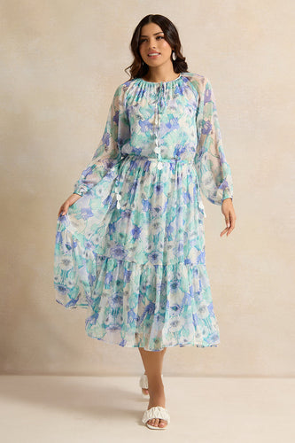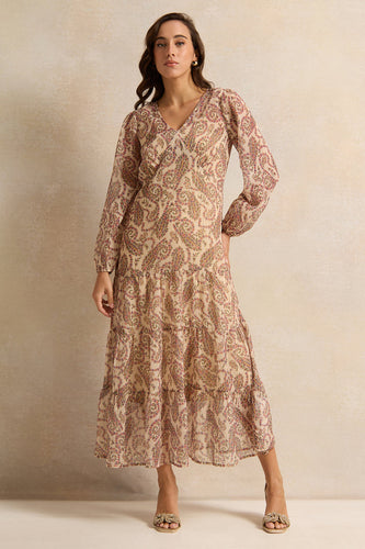 فستان نسائي متعدد الطبقات مطبوع باللون البيج
