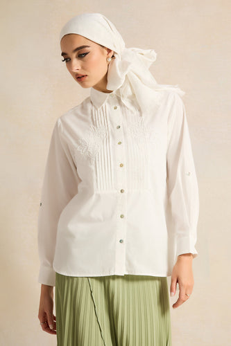 قميص نسائي أبيض مزخرف بياقة