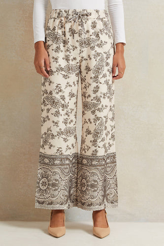 بنطلون نسائي واسع الساق مطبوع باللون البيج