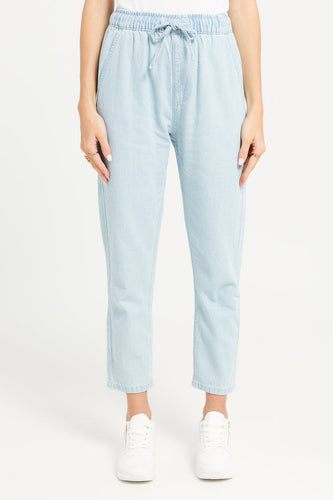 بنطلون جينز نسائي أزرق سادة بخصر مطاطي