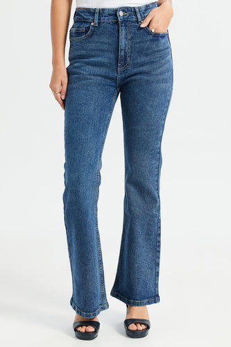 بنطلون جينز نسائي أزرق داكن بساق واسعة وخياطة أمامية