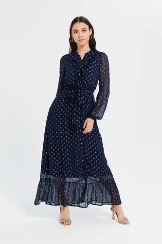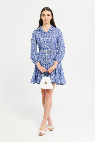 فستان مطبوع بأكمام طويلة باللون الأزرق للنساء