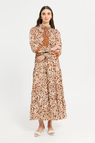 فستان طويل برقبة مكشكشة مطبوع بألوان متنوعة للنساء