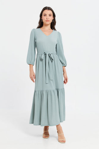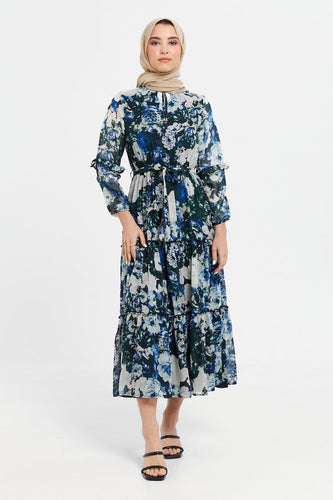 فستان ماكسي نسائي أزرق بطبعة زهور مع حزام