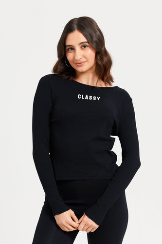 تي شيرت رقبة عالية سوداء وأكمام طويلة مع طباعة