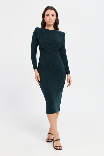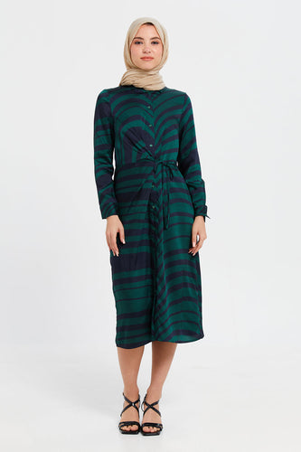 فستان نسائي مطبوع باللون الأخضر مع ربطة عنق من الأمام