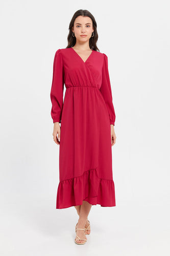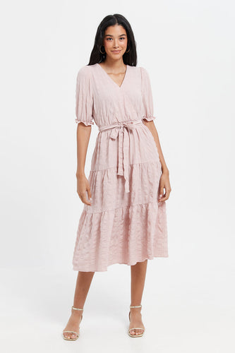 فستان نسائي متعدد الطبقات بأكمام منتفخة باللون الوردي