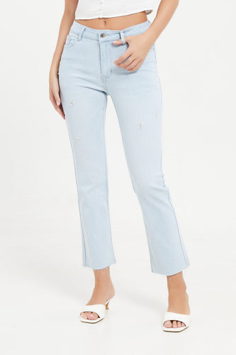 • جينز نسائي أزرق عالي الخصر بقصة ضيقة