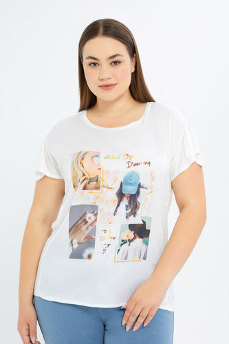 تي شيرت نسائي كريمي قوي بطبعة نسائية