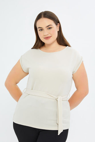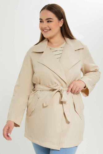جاكيت بحزام باللون البيج للنساء بمقاسات كبيرة