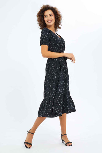 فستان مطبوع برقبة V أسود للنساء