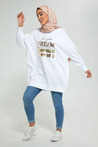 White Embellished Longline Sweatshirt سويتشيرت طويل مزين باللون الأبيض