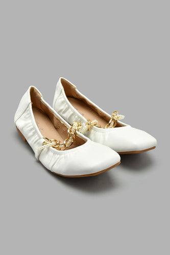 White Elasticated Ballerina With Chain بالرينا بلون أبيض بحواف مطاطية مزينة بسلسال