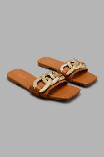 Tan Mule With Chain Trim حذاء مفتوح بلون بني فاتح مزين بسلسال ذهبي